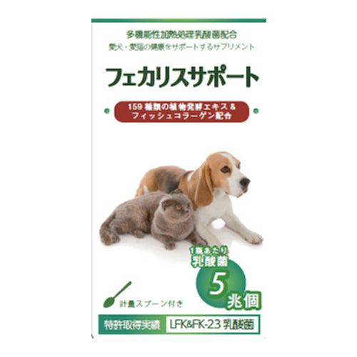 7兆5千億個相当のパワフルな乳酸菌 多機能性加熱処理乳酸菌、159種類の植物発酵エキス&フィッシュコラーゲンを配合。「フェカリスサポート」は、毎日の食事に混ぜたり、おやつとして直接与えるなど、給餌しやすい粉末のサプリメントです。愛犬・愛猫の毎日の健康をサポートします。
